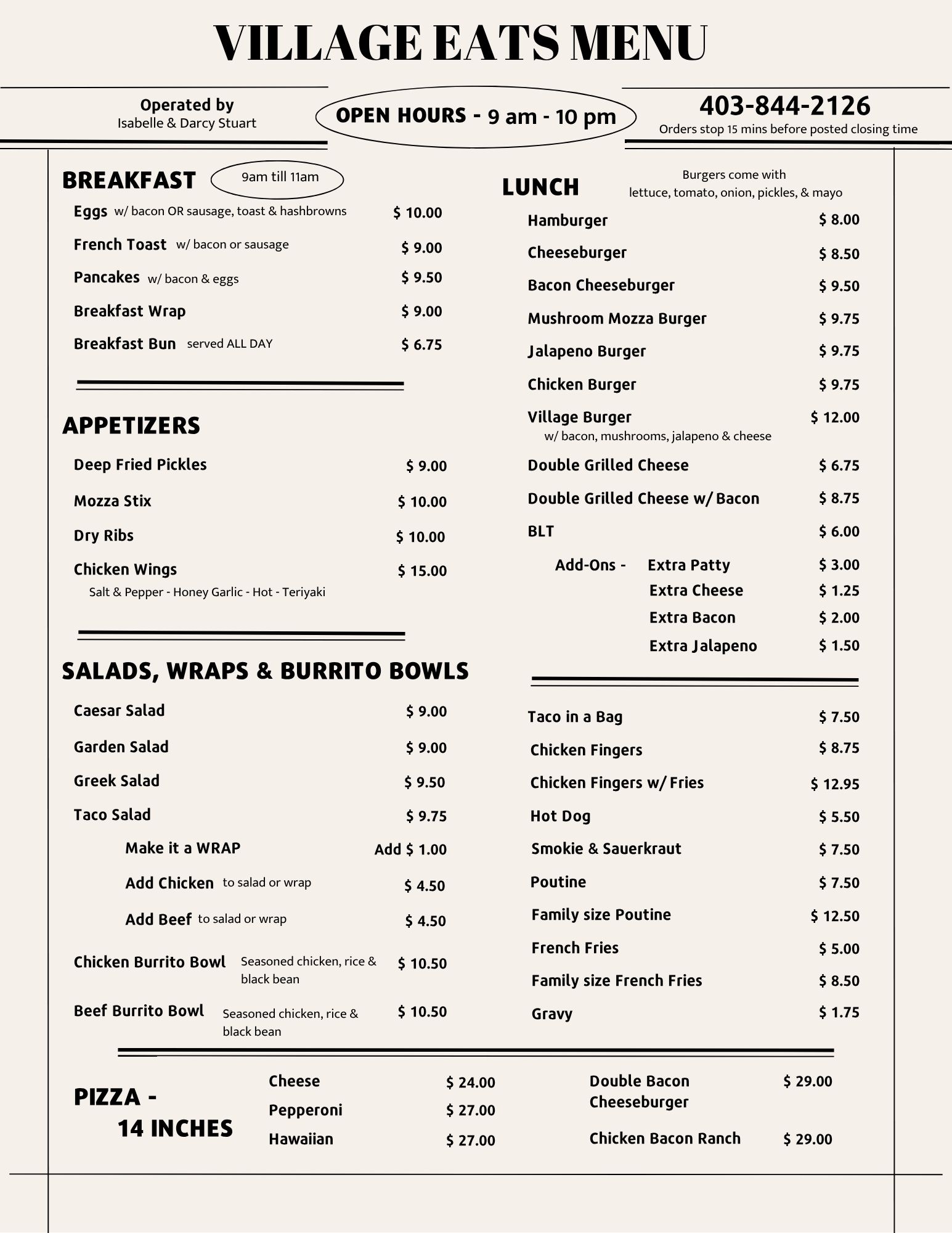 No need to worry if you forgot anything! Come visit us at the Village Eats & General Store for all your needs. We sell camping items, RV parts, local art, toiletries, off-sales, convenience items, groceries, gifts, home-made birthday cakes, party platters, bakery items, concession foods and ice cream.